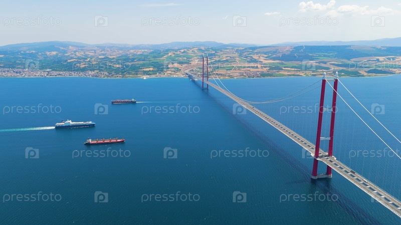 Автомобили, движущиеся над мостом Чанаккале 1915 года и грузовик, плавающий под ним в солнечный день