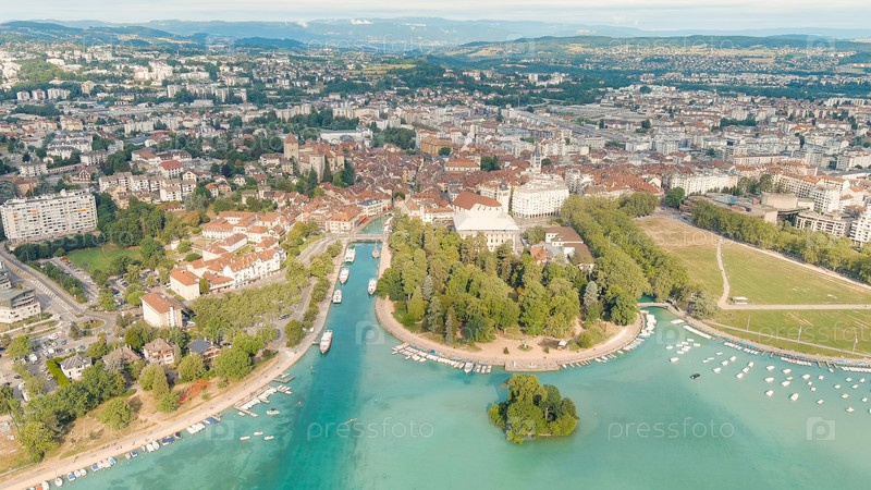 Аннеси, Франция Исторический центр города с рекой Тиу.Аннеси - город в Альпах на юго-востоке Франции, Aerial View