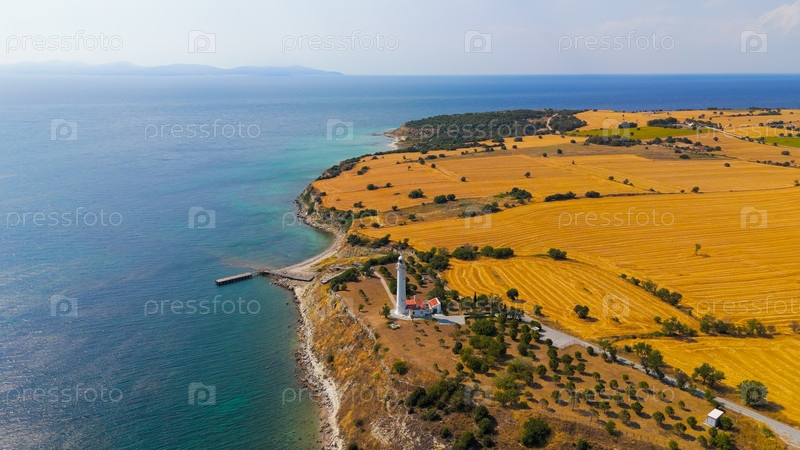 Исторический маяк Мехмедчик Фенери стоит у входа в Дарданелльский пролив с панорамным видом на побережье Эгейского моря