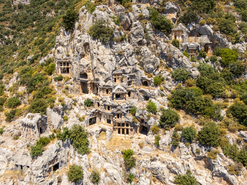 Вертикальный ближайший взгляд из воздуха на древние ликийские вырезанные в скалу гробницы, высеченные в крутой обрыве у Миры, несколько фасадов храмов, поднимающихся вертикально под ярким летним солнцем
