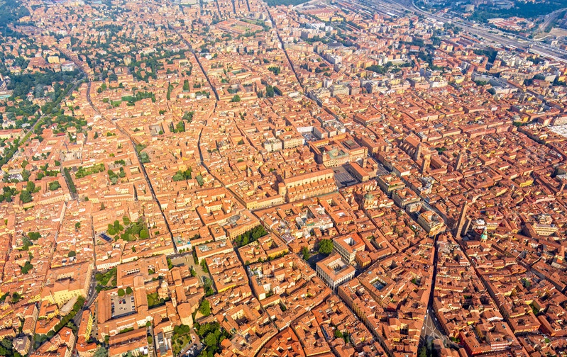 Болонья, Италия Исторический центр Панорама города в летний день Солнечная погода Вид с воздуха