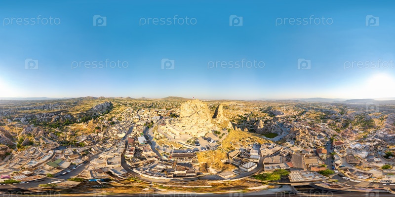 Учисар, Невшехир, Турция. сферический 360x180 панорамный вид с воздуха на Замок Учисар, самую высокую точку в Каппадокии, с видом на долины и скальные образования