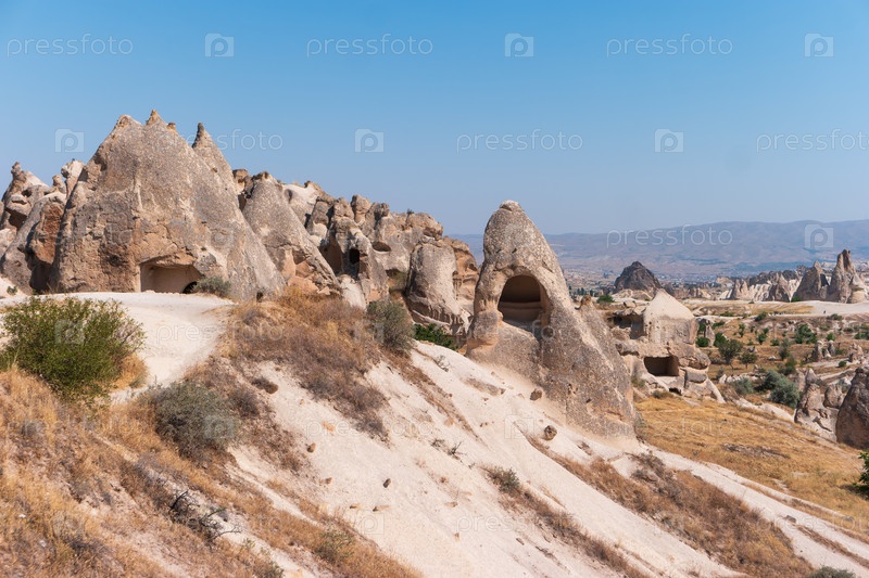 Эрозированные песчанистые холмы с естественными арками и пещерами, редкими кустарниками и небольшими деревьями, простирающиеся до дальнего горизонта под чистым голубым полуденным небом