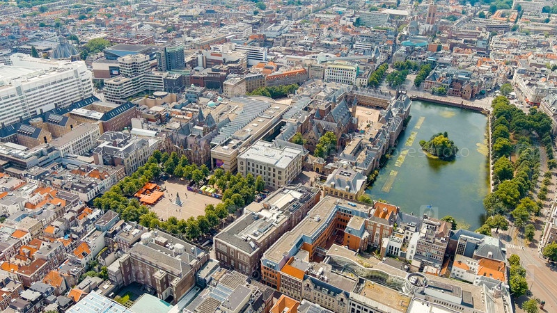 Гаага, Нидерланды. Binnenhof. Озеро Хофвиджвер в историческом центре города. Облачная погода. Летний день, Aerial View