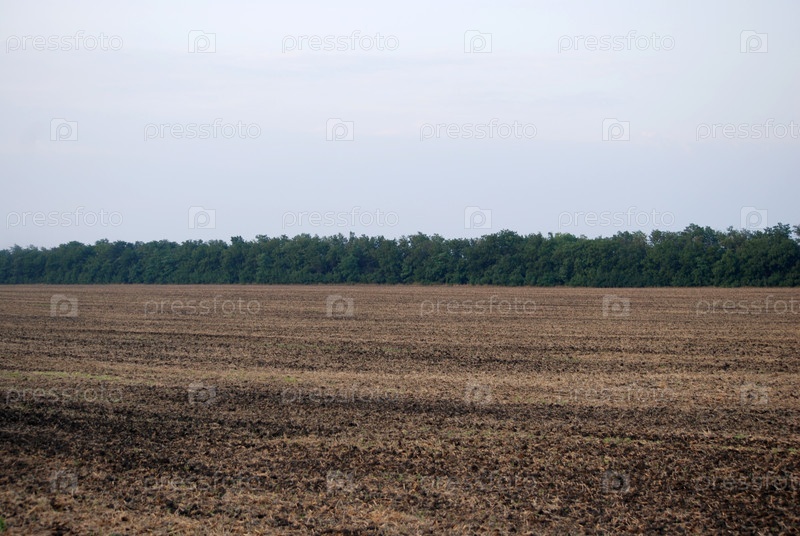 Поле, где был собран урожай. Широкое поле с черной землей и остатками соломы