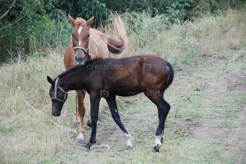 Две лошади пасутся на лугу