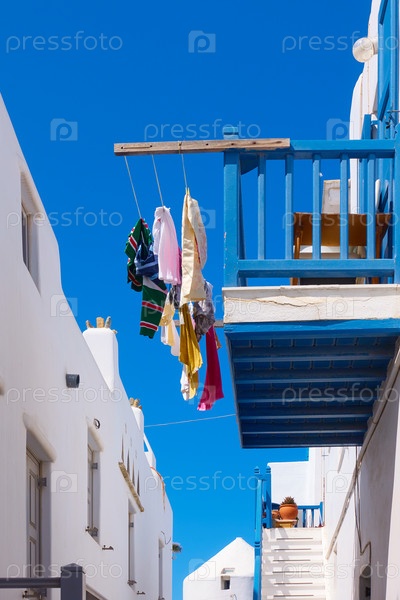 Балкон с проветривающейся одеждой на Миконосе