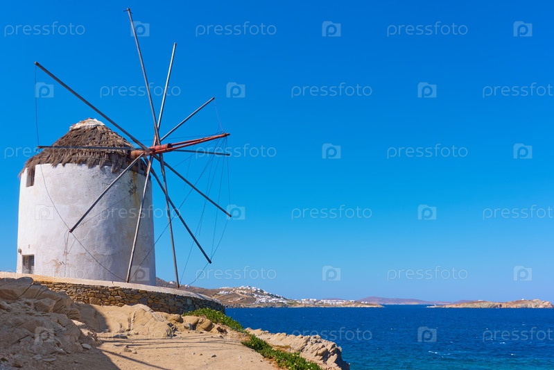 Старая белая ветряная мельница на берегу моря в Миконосе