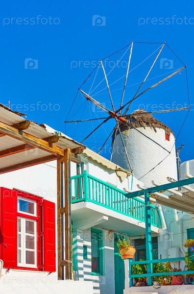 Улица с ветряной мельницей в Миконосе,