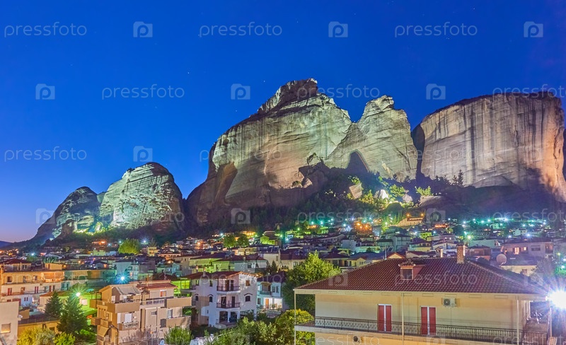 Скалы метеоры и город Калабака ночью