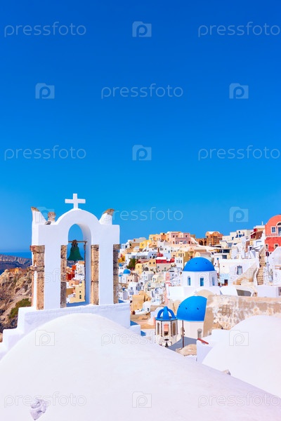 Греческий пейзаж со старым колокольником в городе Оя на Санторини