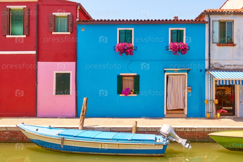 Канал с лодками и красочными домами в Бурано на Венецианском канале
