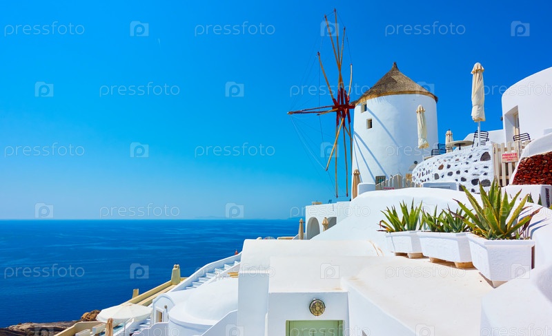 Греческий пейзаж со старой ветряной мельницей на Санторини