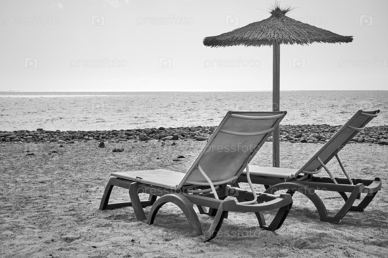 Пляж с зонтиком и длинными креслами