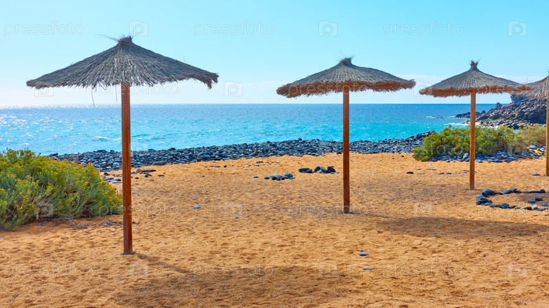 Песчаный морской пляж с рядом зонтиков