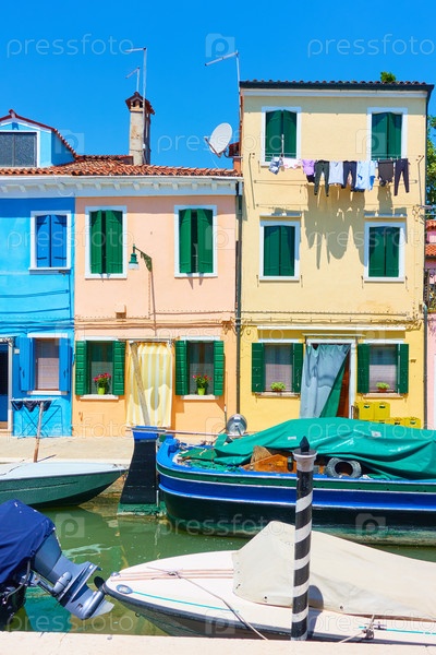 Лодки и красочные дома у канала в Бурано, Венеция