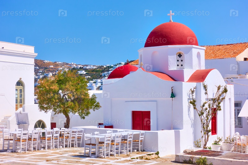 Площадь с старой греческой церковью в Миконосе
