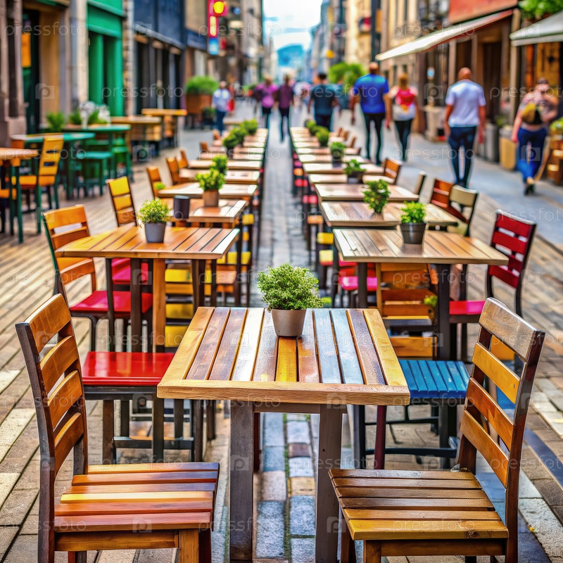 Красочные деревянные столы и стулья выстроились вдоль европейской улицы