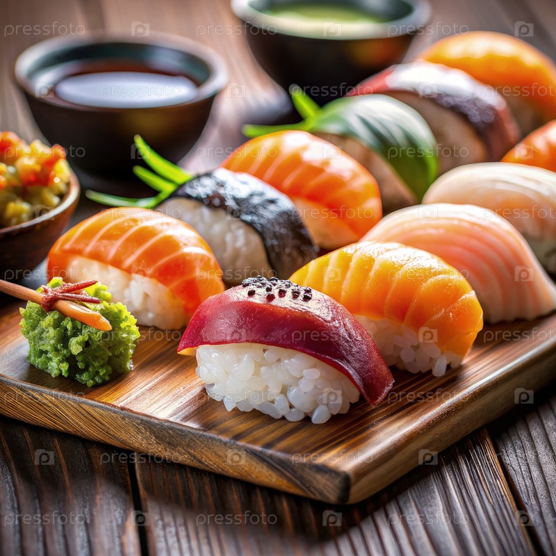 Свежеизготовленный суши с лососем Нигири на деревянной подносе