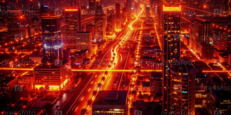 Вид из воздуха на городской пейзаж ночью с помощью оранжевых неоновых фонарей