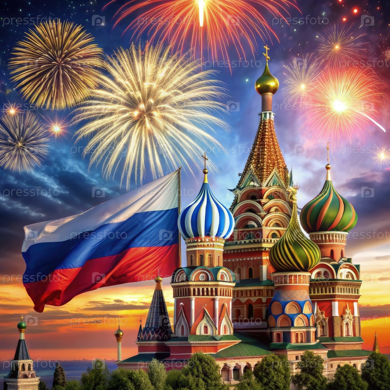 Фейерверк над собором Святого Василия во время празднования Дня России