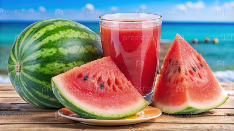 Освежающие кусочки арбуза и сок на берегу моря в солнечный день
