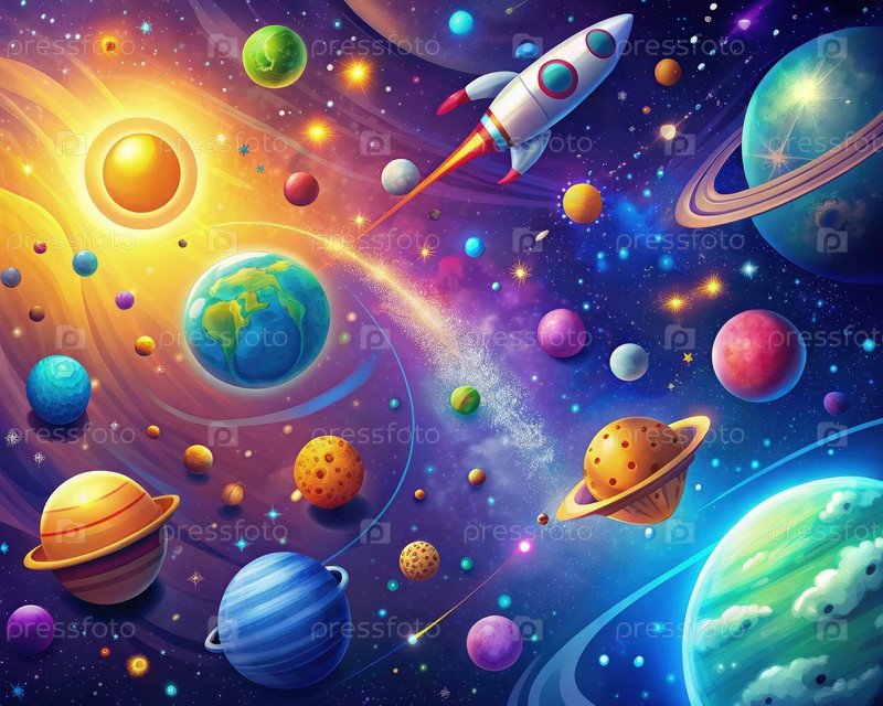 Красочная космическая иллюстрация с ракетой и несколькими планетами. генеративный ИИ