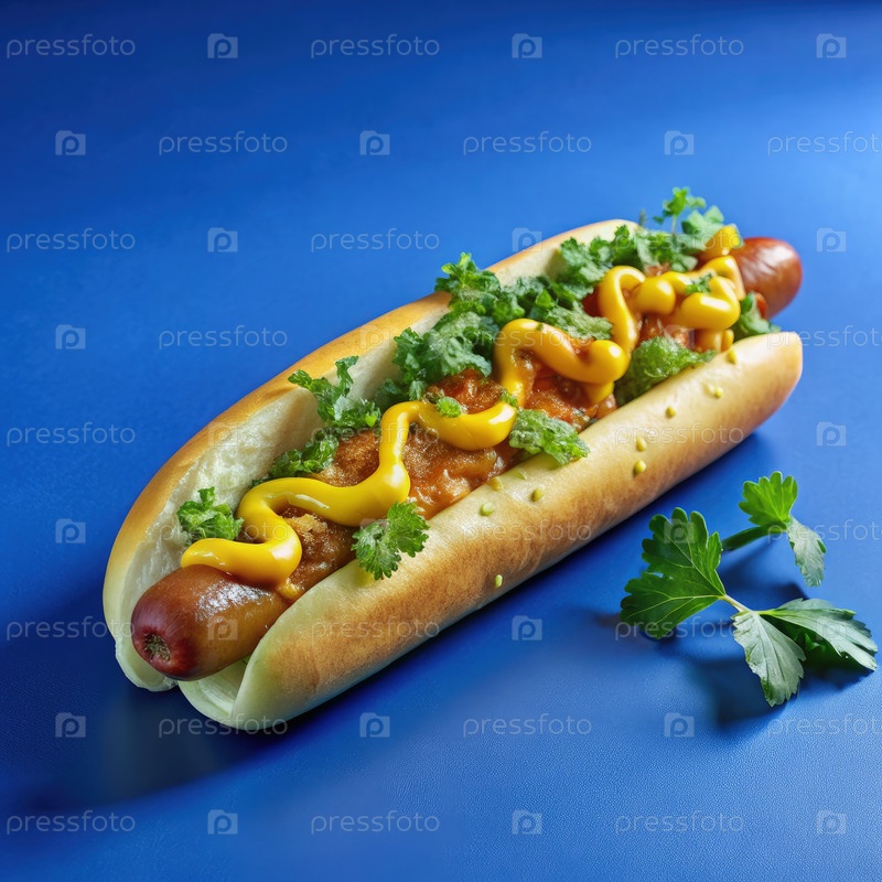 Близкий взгляд на вкусный хот-дог, покрытый пряным сыром, горчицей и петрушкой