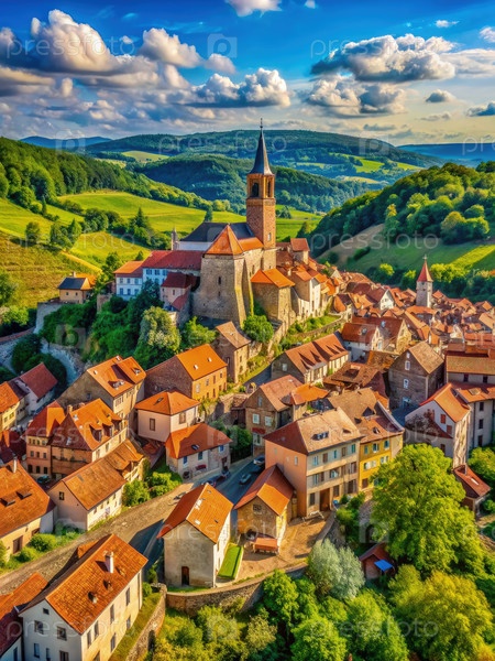 Вид с воздуха живописного средневекового города, расположенного в Ролинг-Хиллз