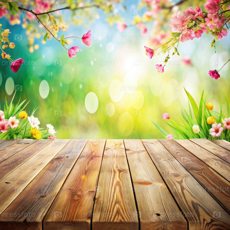 Деревянный столешничный стол с весенними цветами и размытым фоном