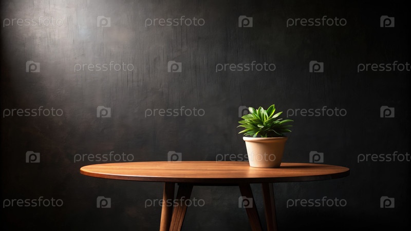 Горшечное растение на деревянном столе против темного фона