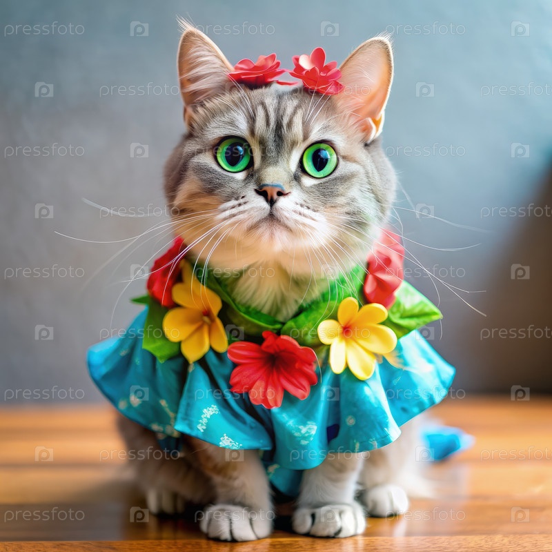 Очаровательный кот, одетый как Лило в гавайский наряд