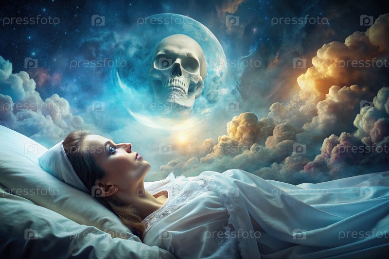 Женщина спит с черепом Луна мечтает. генеративный ИИ