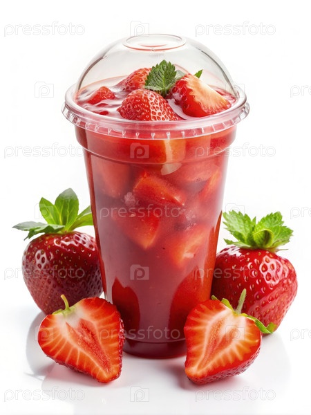 Свежий клубничный сок в одноразовой чашке с целыми и нарезанными ягодами