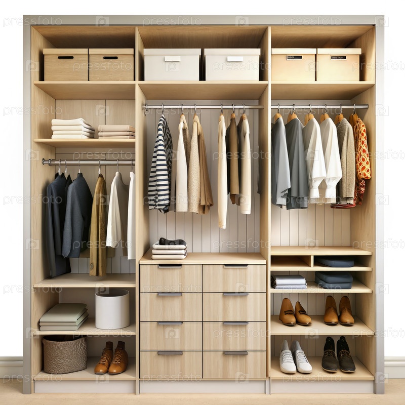 Хорошо организованный шкаф с деревянными полками и ящиками