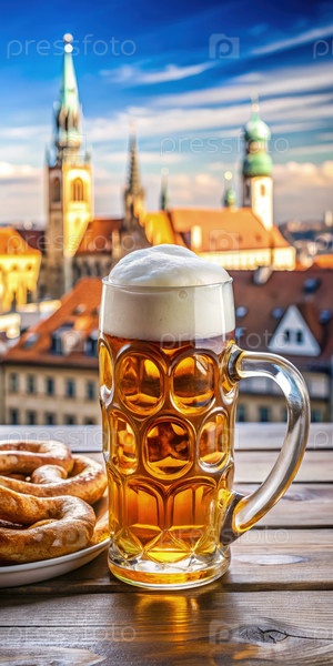 Баварский пивной сад со стаканом мюнхенского пива и прецеллов