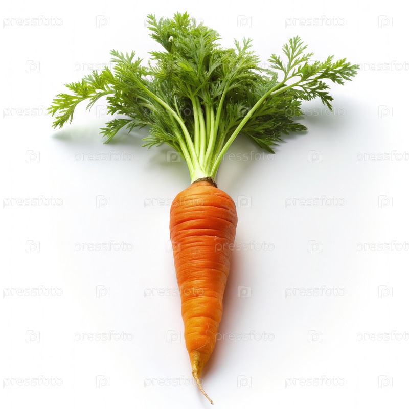 Одинокая свежая морковь с зеленой вершиной на белом фоне