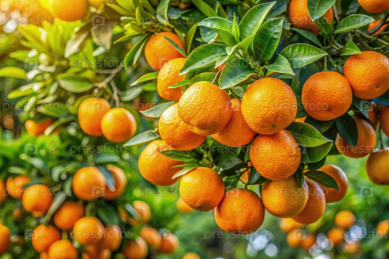 Зрелые апельсины, висящие с ветви в солнечном саду