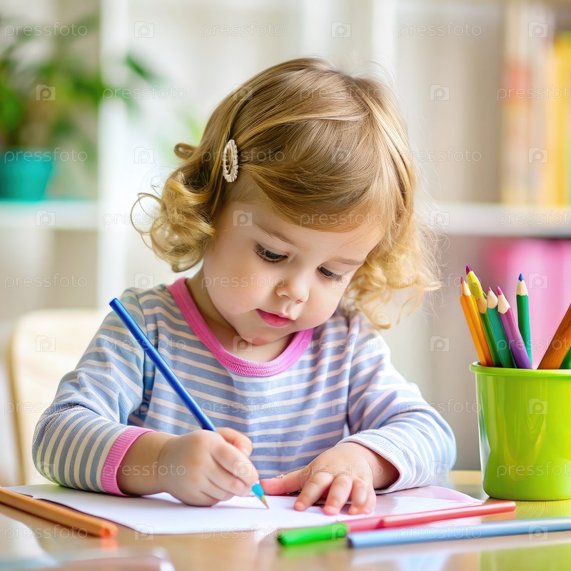 Молодая девушка концентрируется на рисовании за столом цветными карандашами
