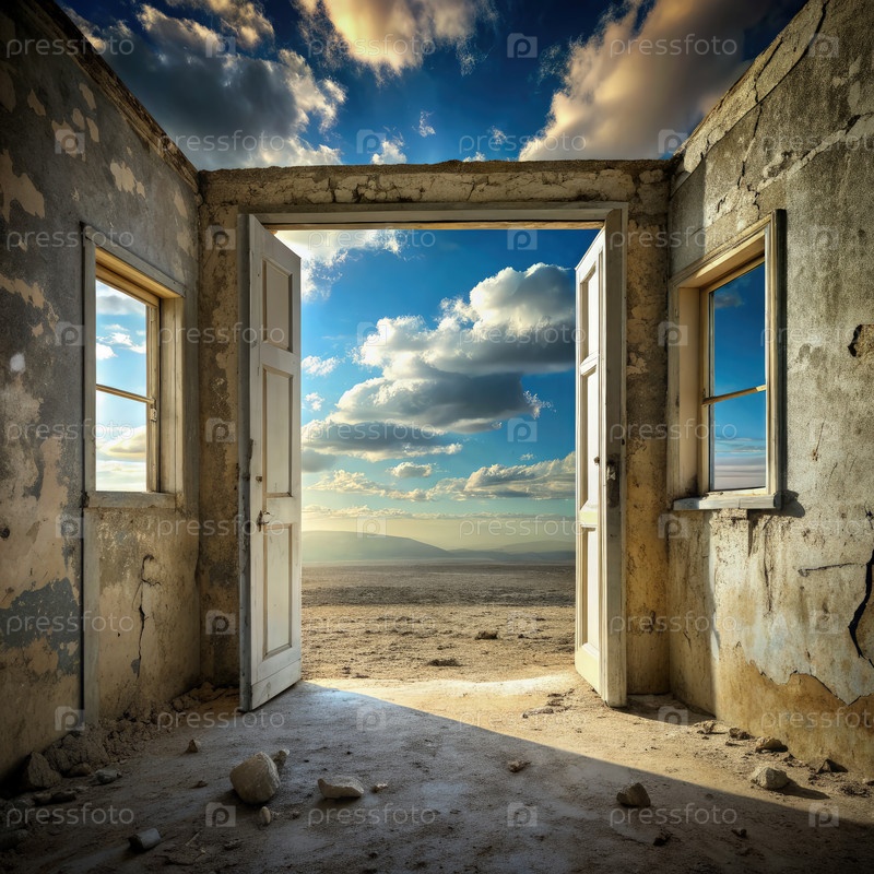 Заброшенная комната с открытыми дверями, ведущими к пустынному пейзажу под голубым небом