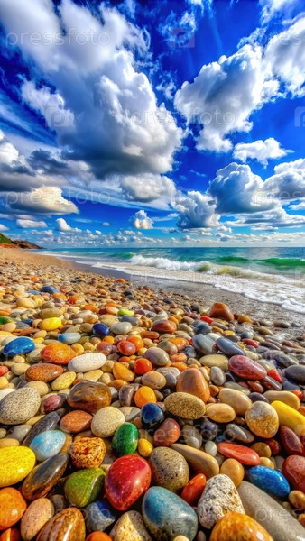 Цветные камни на солнечном пляже с голубыми небесами и белыми облаками