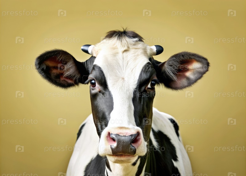 Близкий портрет черно-белой молочной коровы на желтом фоне