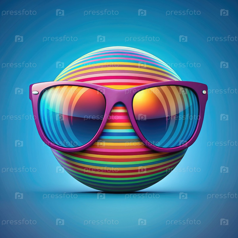Цветная полосатая сфера, носящая солнцезащитные очки на синем фоне