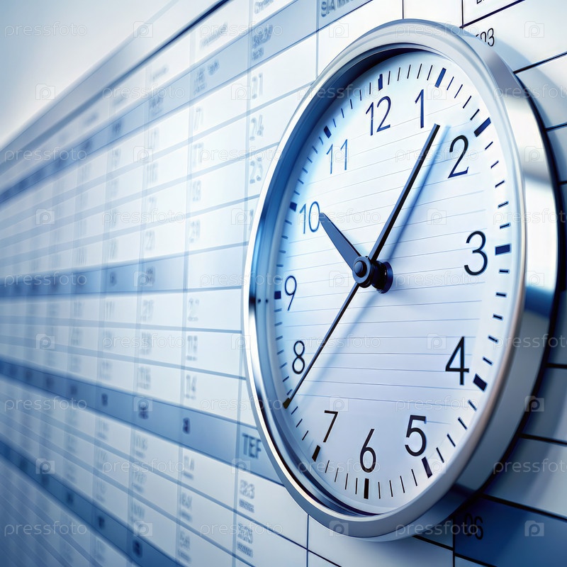 Клубовый снимок настенных часов и графика заседаний: Близкий снимок серебряного настенного часа с черными стрелками, установленный над детальной сеткой графиков совещаний. Часы расположены справа от изображения, а решетка расписания простирается влево. Вр