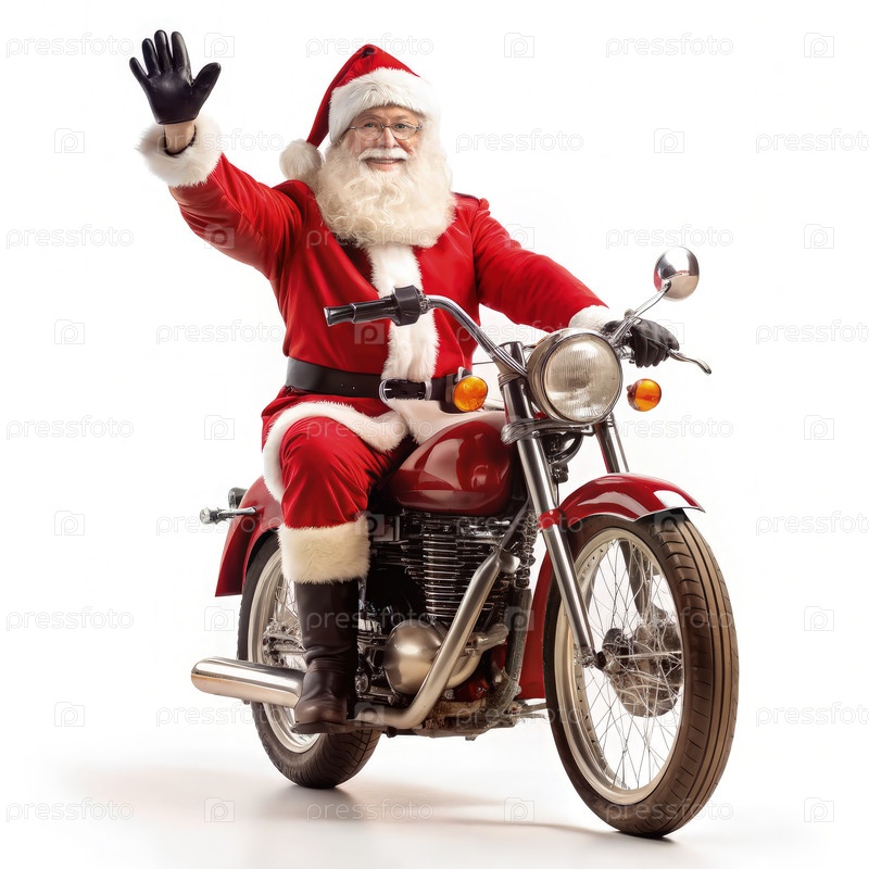 Санта-Клаус едет на мотоцикле и машет белым фоном