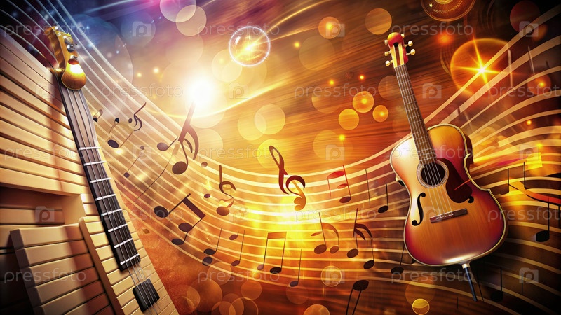 Золотая акустическая гитара с музыкальными нотами на деревянном фоне