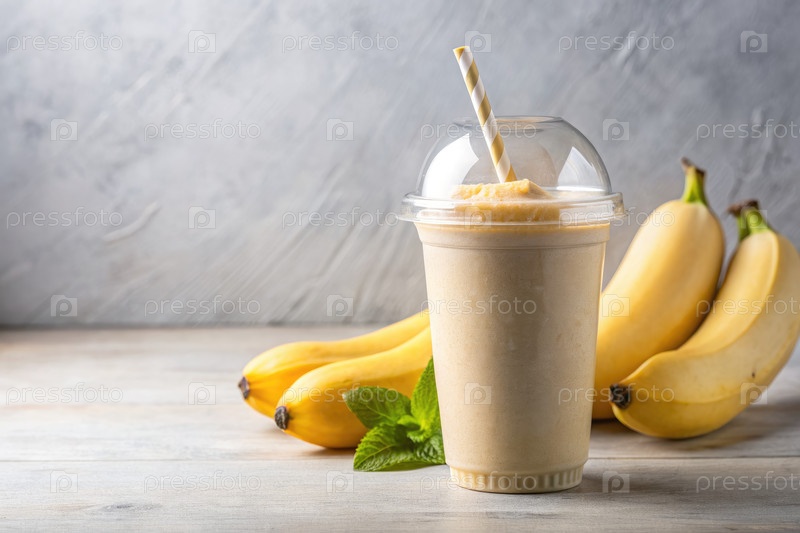 Холодный банановый смузи в пластиковой чашке со сломкой и свежими бананами
