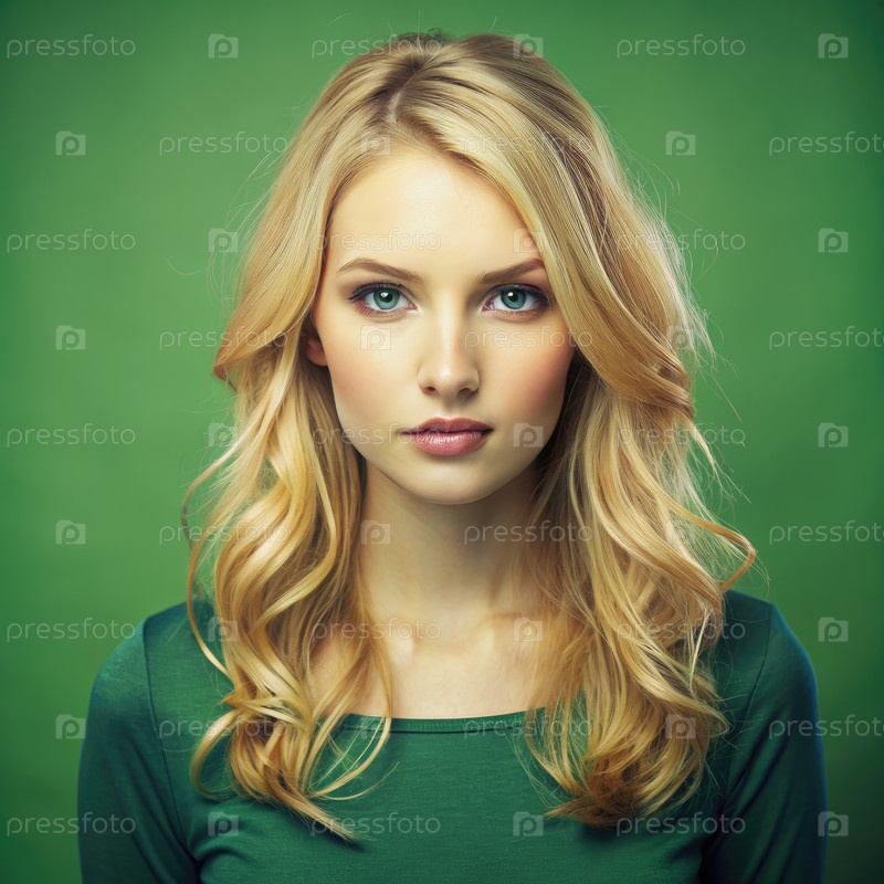 Блондинка с зелеными глазами позирует на зеленом фоне