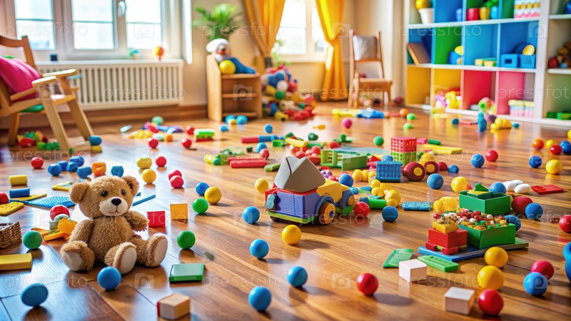 Беспорядочный пол игровой комнаты заполнен игрушками после дня игры
