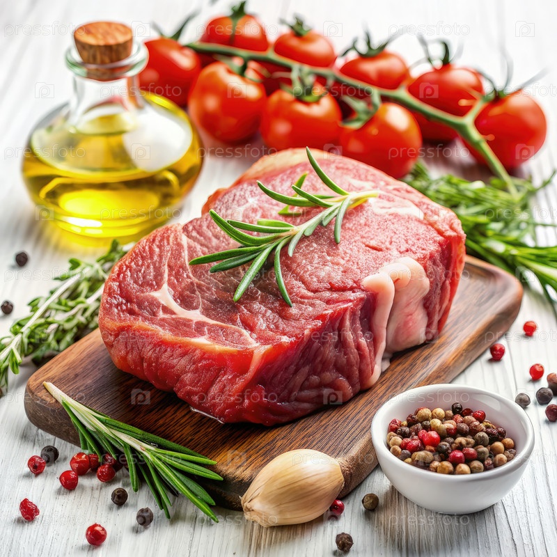 Стейк из говядины с розмарином и пряностями на деревянной режущей доске